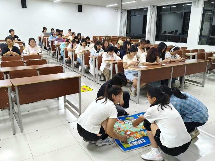 同学们被分成 4-6 人一组,游戏过程中,同学们轮流掷骰子决定前行步数并回答安全知识题目,答对则继续前行。大家相互交流、齐心协力应对各种挑战,现场气氛活跃。