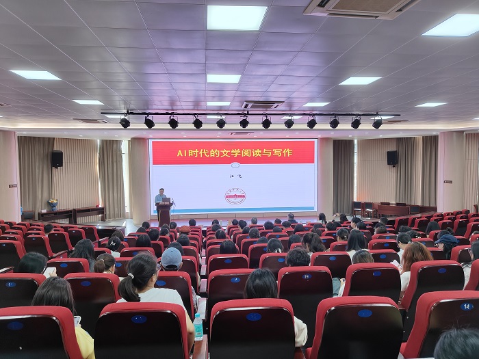 4月25日下午,安徽省作家协会副主席、安徽文艺评论家协会副主席、安庆师范大学人文学院教授江飞应邀在我校文端楼二楼报告厅作《AI时代的文学阅读与写作》学术报告。黄山市青年作家胡玉琪、汪远定、郭飞及文学院、外国语学院相关师生参加,报告由文学院副院长朱宏胜主持。