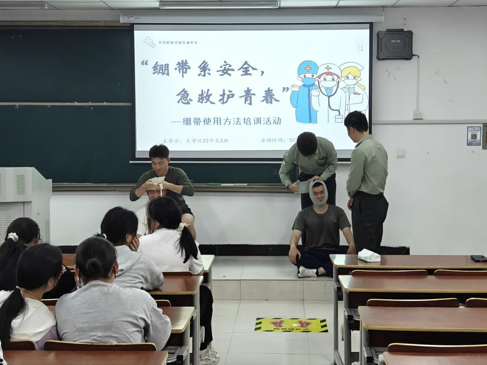 5月7日在文端楼2512教室开展了一场别开生面的急救技能培训活动。此次活动以“绷带系安全,急救护青春”为主题,邀请到了来自黄山学院国防育英社下属荣誉宣讲团的三名教官为同学们进行科普,教官们将专业急救知识与实践操作巧妙结合,为同学们带来了一堂生动实用的生命教育课。活动旨在通过实操训练提升同学们的应急救护能力,让青春多一份安全保障。