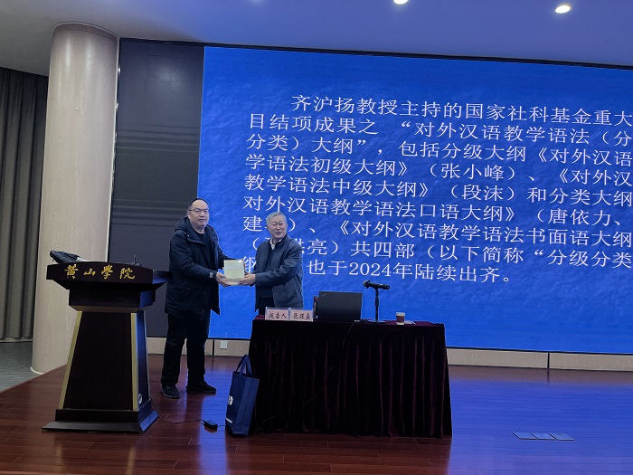 报告会前,沈昌明院长代表文学院接受了张旺熹教授主编的对外汉语教学语法丛书之《对外汉语教学语法初级大纲》《对外汉语教学语法中级大纲》《对外汉语教学语法口语大纲》《对外汉语教学语法书面语大纲》,并合影。