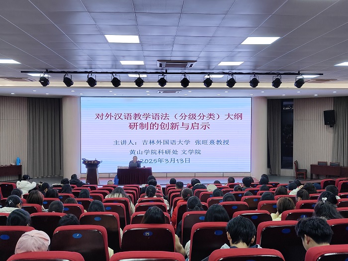 3月13日晚,吉林外国语大学国际传媒学院张旺熹教授应邀来我校作了题为《“对外汉语教学语法(分级分类)大纲”研制的创新与启示》的学术报告。报告会在文端楼二楼报告厅举行,文学院师生近200人参加活动,文学院院长沈昌明主持报告会。