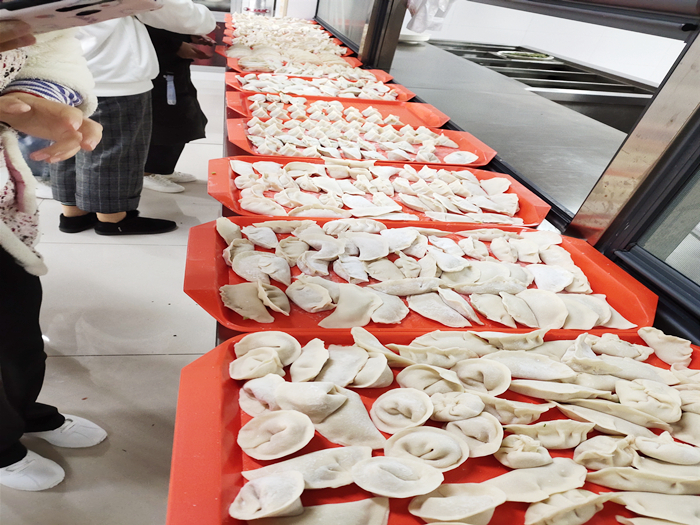 活动伊始,全班同学进行简单分组,各组分工完成自己组别的任务。活动过程中,大家相互比较谁的饺子包的好看,相互借鉴学习,同时也请到食堂的工作人员对我们进行指导。