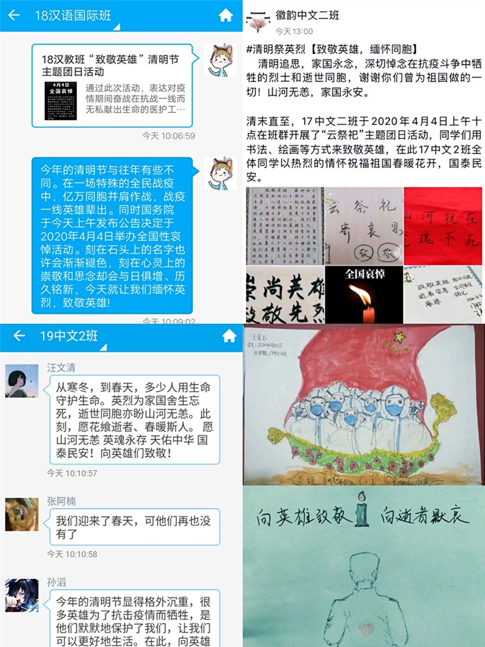 为表达对抗击新冠肺炎疫情斗争牺牲烈士和逝世同胞的深切哀悼,4月4日,文学院组织各班级开展了以“致敬英雄”为主题的线上团日活动。