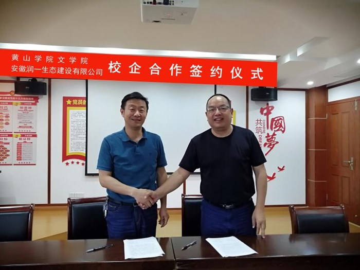 6月12日,黄山学院文学院与安徽润一生态建设有限公司共建实习、实训基地签约仪式在黄山雾云间生态庄园举行。该院党总支书记汪方学、副院长沈昌明、党总支副书记周志荣、安徽润一生态建设有限公司董事长赵昌恒等出席签约活动。