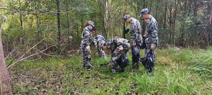 活动之前,各班级军训负责人为同学们分发一次性手套、垃圾袋。在军训教官和辅导员的带领下,同学们迈着整齐步伐前往卫生责任区学生公寓。随着教官的一声令下,同学们立即四散开来拾捡垃圾,到宿舍楼下寻找不易发现的垃圾。活动结束后,同学们井然有序将装满垃圾的袋子进行回收整理。