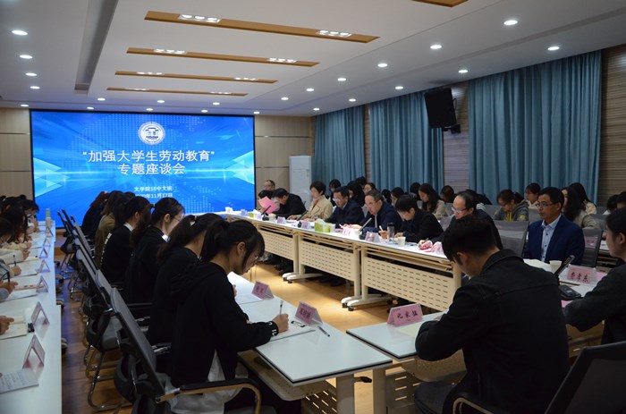 座谈会共有三项议程,首先是学生代表以“加强大学生劳动教育”为主题进行发言,分别从开展劳动教育的目的意义、实现途径、生活与劳动教育衔接、劳动教育的评价机制等方面阐述了各自的看法。与会领导老师结合工作实际与学生进行交流,从不同的角度与同学们探讨劳动教育工作中的问题、如何让同学们自觉劳动教育、促进“教、学、做”三位一体等方面的内容。