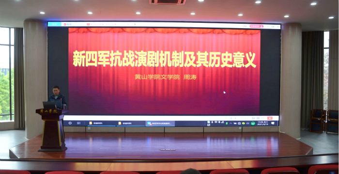 414日下午,黄山学院“行知讲坛”第126讲在文端楼二楼报告厅举行。文学院教师周涛博士应邀作了题为“新四军抗战演剧机制及其历史意义”的报告。报告会由文学院副院长沈昌明主持,近200名师生到场聆听。
