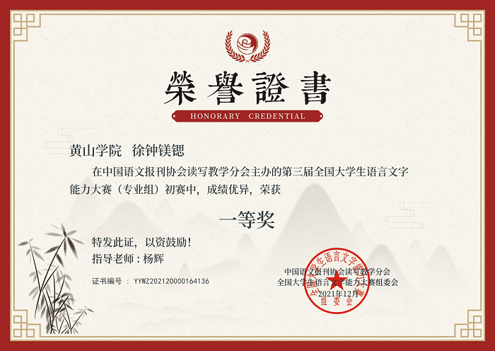 由中国语文报刊协会读写教学分会主办的第三届“全国大学生语言文字能力大赛”初赛已于日前落幕,黄山学院文学院学子在比赛中取得优异成绩,其中徐钟镁锶同学获得专业组一等奖,陈卉、鲁慧、刘乐琦同学获得专业组三等奖。