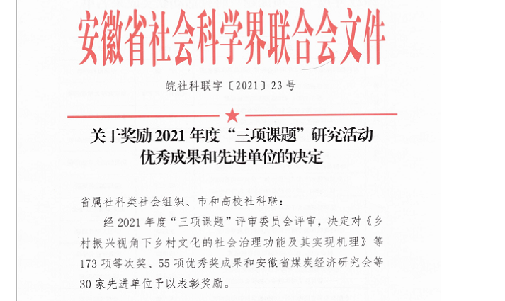 近日,安徽省社会科学界联合会公布了2021年度“三项课题”研究活动优秀成果奖名单,我院杨辉老师和戴元枝老师分别获得二等奖。