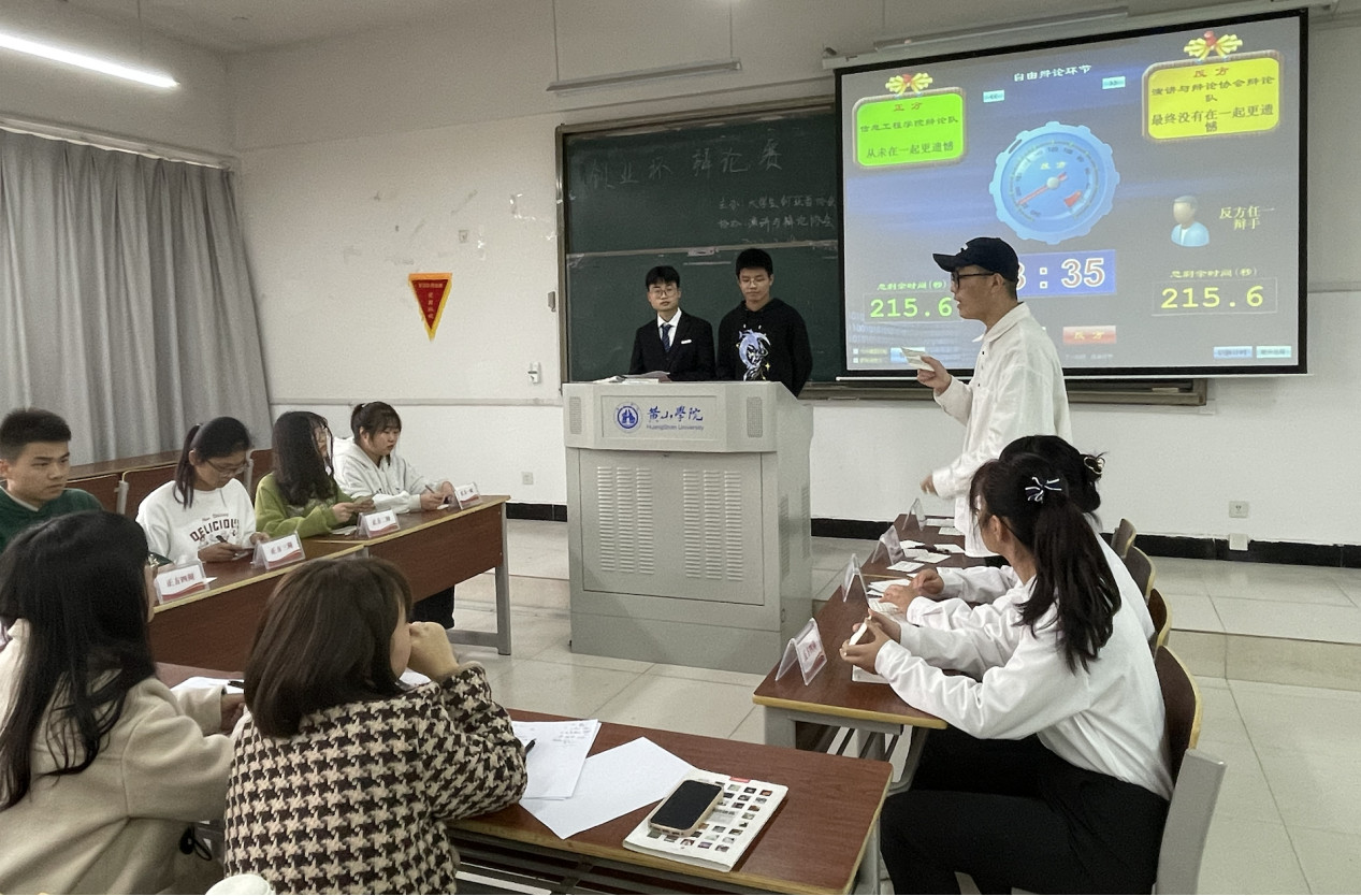 本次活动分为4场进行,同学按照事先抽签决定的辩题和顺序进行比赛。比赛过程中,双方辩手对己方观点进行充分的论证,在一对一攻辩环节,各方辩手引经据典,互不相让,运用巧妙的语言说出己方观点,精彩的对决将比赛气氛推向了高潮。自由辩论环节,各组选手针锋相对,步步紧逼,比赛进入白热化。最后进行总结陈词,本次辩论赛圆满结束。