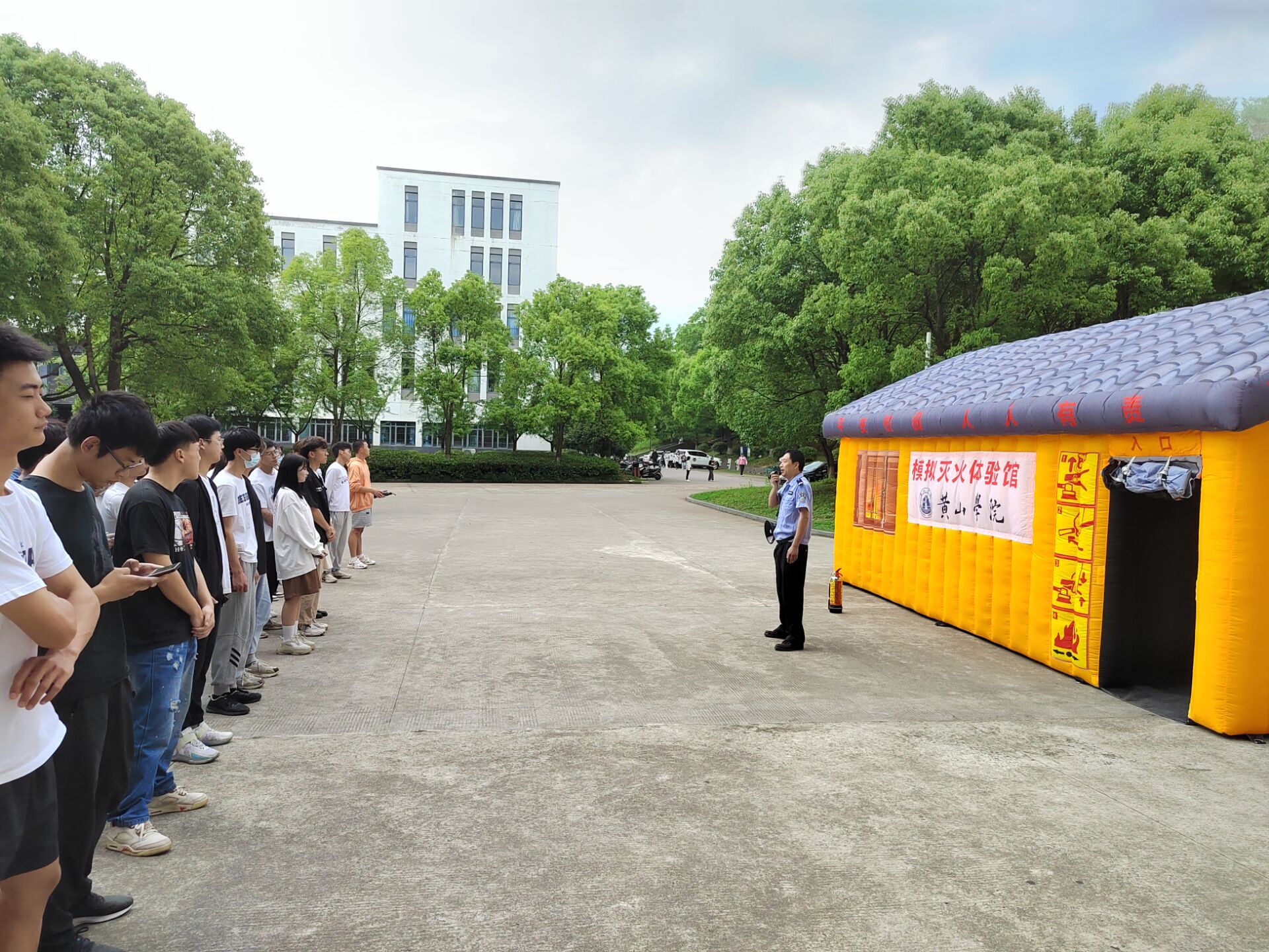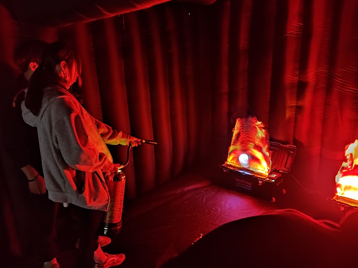 本次活动主要以培训消防基础知识为主,内容涉及宿舍发生火灾事故的原因、如何报火警、如何正确使用灭火器、如何扑救初起火灾和如何进行疏散逃生。在培训现场,工作人员搭建了模拟烟雾逃生体验馆和模拟灭火体验馆,运用科技手段仿真进行火场疏散逃生演练和灭火实战培训。在现场工作人员的讲解和指导下,同学们分别进入体验馆感受火灾场景,演练快速疏散逃生,学习使用灭火器扑灭初起火灾。