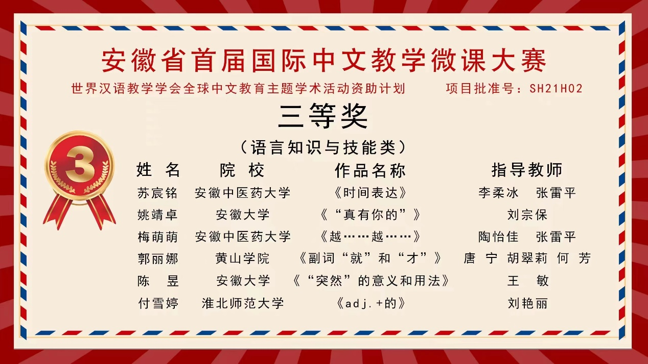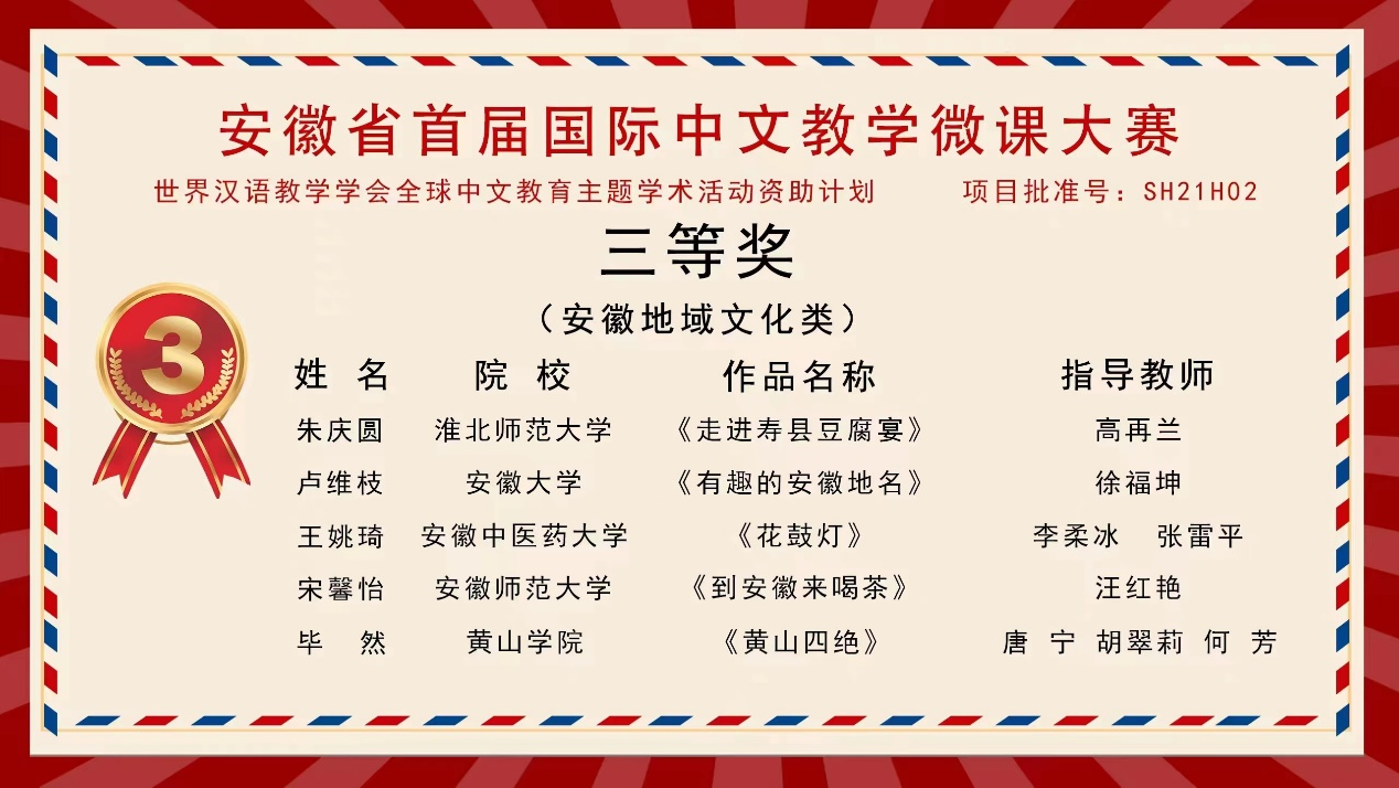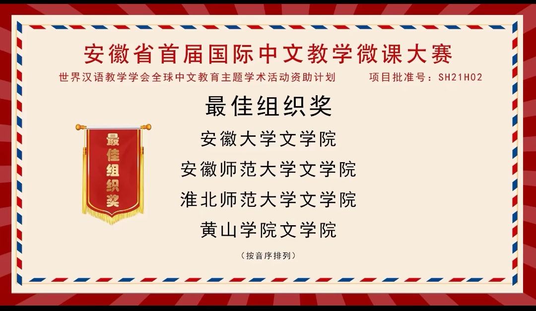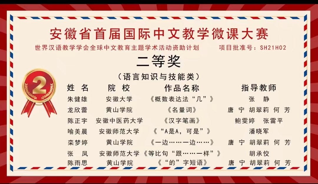 11月20日,安徽省首届国际中文教学微课大赛结果揭晓。我校文学院汉语国际教育专业12名同学经过激烈角逐,3人获二等奖 、2人获三等奖、7人获优胜奖,在同类院校中处在前列。黄山学院荣获“最佳组织奖”。