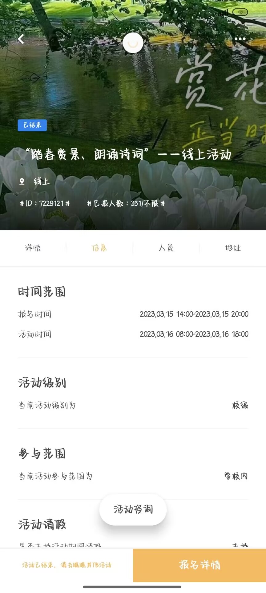 云想衣裳花想容,春风拂槛露华浓。2023年3月18日,由黄山文学社举办的踏春赏景朗诗词活动活动圆满完结,参与人数约200人。 参与者认真且有感情的朗诵一段诗词,并将其音频上传到相关工作人员的QQ邮箱中。本次诗词创作活动评选出了十名优秀作品,获奖者皆可获得精美小礼品一份。 此次活动让同学们在沐浴春光中感悟诗词魅力,有利于增加同学们对诗词文化的了解,丰富同学们的课余文化生活,促进校园文化建设。