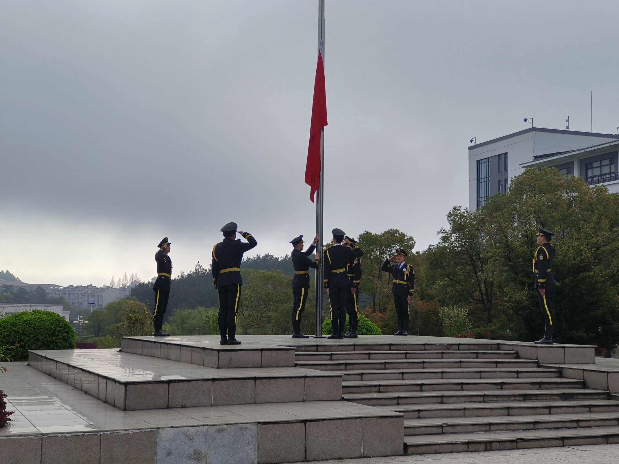 8时整,升旗仪式正式开始。迎着朝阳,国旗护卫队成员迈着铿锵的步伐来到了国旗台下,全场一片肃静。清晨微风轻拂五星红旗,灼灼目光共护国旗飘扬,在激昂的《义勇军进行曲》中,鲜艳的五星红旗冉冉升起,迎风飘扬。