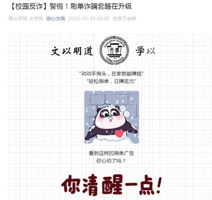 该院通过微信公众号发布反诈系列推文,利用图文结合的方式,揭秘刷单引流类等诈骗套路,引发了同学们的热烈讨论与思考,强化了同学们的防范意识和法律意识。