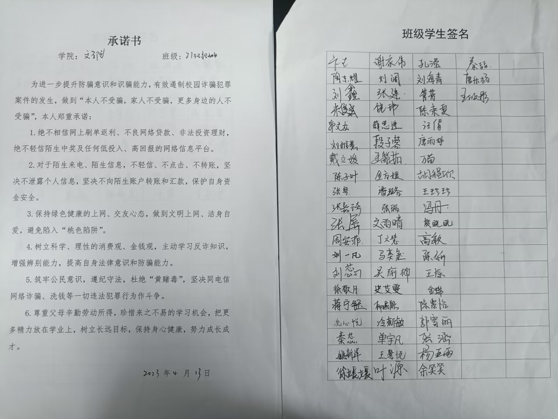 宣传教育活动期间,该院各班级陆续召开电信网络诈骗主题班会,班级辅导员详细解读了“什么是电信诈骗、新形势下电信诈骗的演变、常见的诈骗手法及防范措施”等知识,进一步提高学生的防诈骗意识,并组织同学们签订防范电信网络诈骗承诺书,增强防范意识和责任。