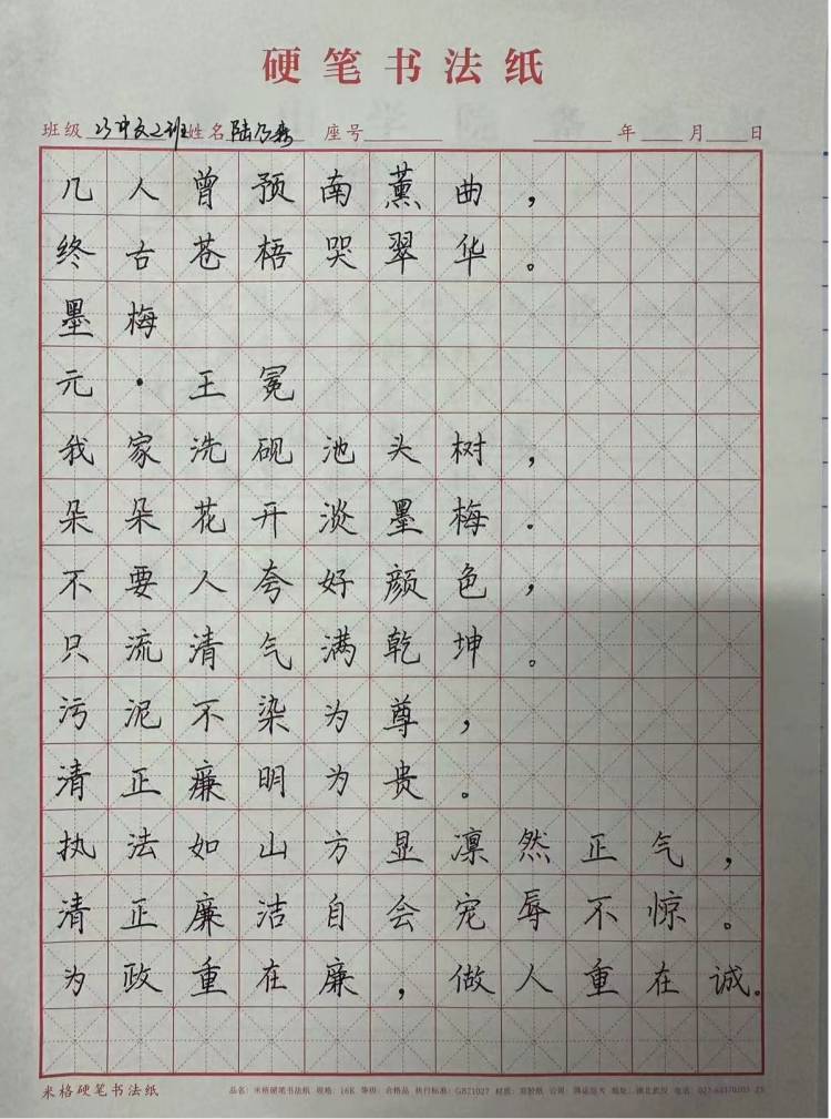 本次比赛分为软笔书法和硬笔书法两个组别,吸引了30余名同学报名参加。比赛现场,选手们执笔凝神,认真构思,一笔一划、横平竖直尽显书写功底,从“养浩然正气、崇廉洁风尚”到“两袖清风照日月、一身正气壮乾坤”,无不提醒我们,必须始终自觉筑牢思想防线,随时保持清醒头脑。经过评选,21中文1班陈紫怡和23汉教班谢恩泽荣获软笔组一等奖,23中文1班李宏宇、23中文2班陆乃森荣获硬笔组一等奖。