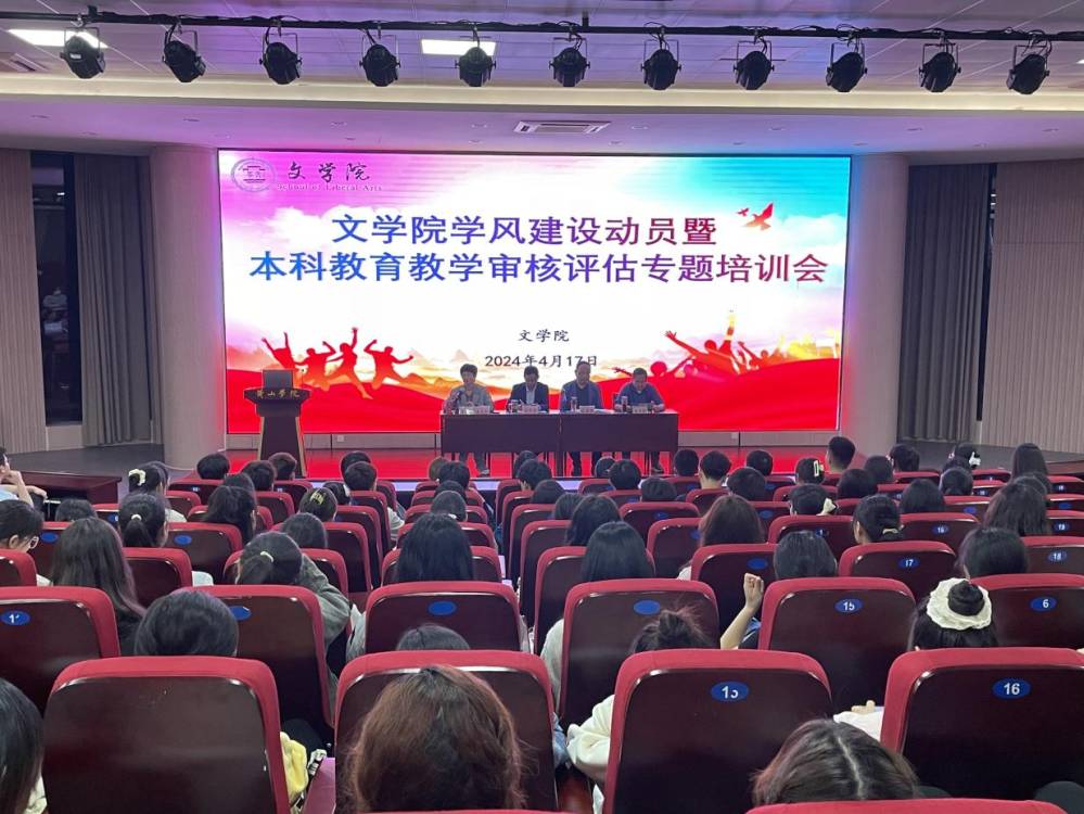 为进一步提高全院师生对审核评估工作重要性的认识,持续推动学风建设,推动学院本科教育教学审核评估高质量完成。4月17日晚七点,文学院学风建设动员暨本科教育教学审核评估专题培训会于文端楼二楼报告厅隆重举行。院党总支书记汪方学、院长沈昌明、党总支副书记周志荣、副院长朱宏胜、团委负责人、专职辅导员、全体学生干部参加会议。会议由周志荣主持。