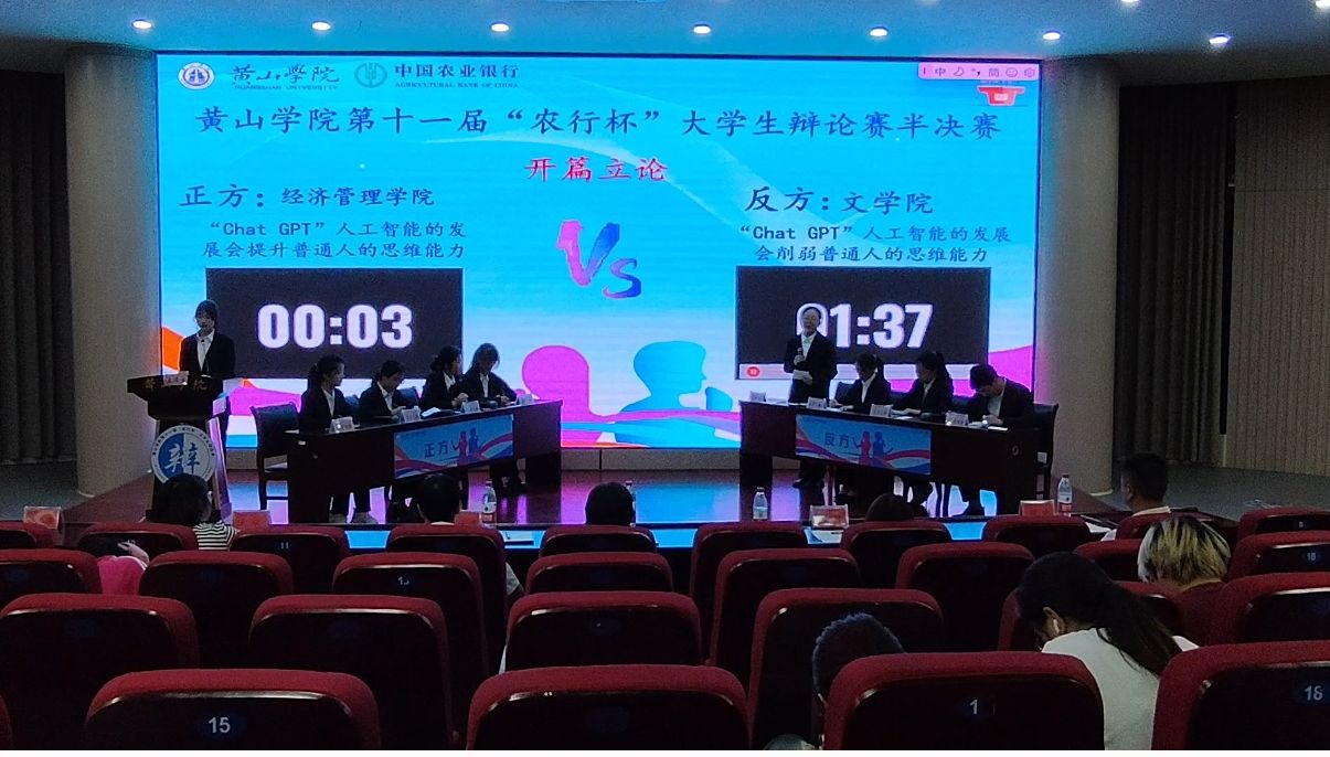 半决赛,我院辩论队与经济管理学院就“Chat GPT”人工智能的发展会提升还是削弱普通人的思维能力”展开了激烈的角逐,队员们不卑不亢,张弛有度的辩词,再次以5比0绝对优势获得胜利。
