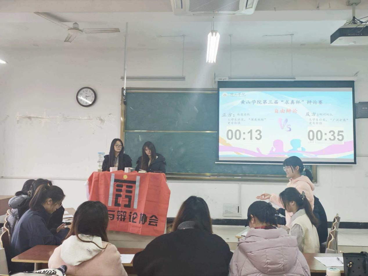 2025年12月6日黄山学院第三届“求真杯”辩论赛决赛在文端楼2205教室正式开赛。本次赛事由校“演讲与辩论协会”主办,比赛接连展开,现场氛围热烈,思辨气息浓厚。