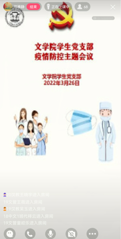 3月26日下午,文学院学生党支部线上召开疫情防控主题会议,该院的全体学生党员参加了此次会议,会议由文学院学生党支部书记邓雅静主持。