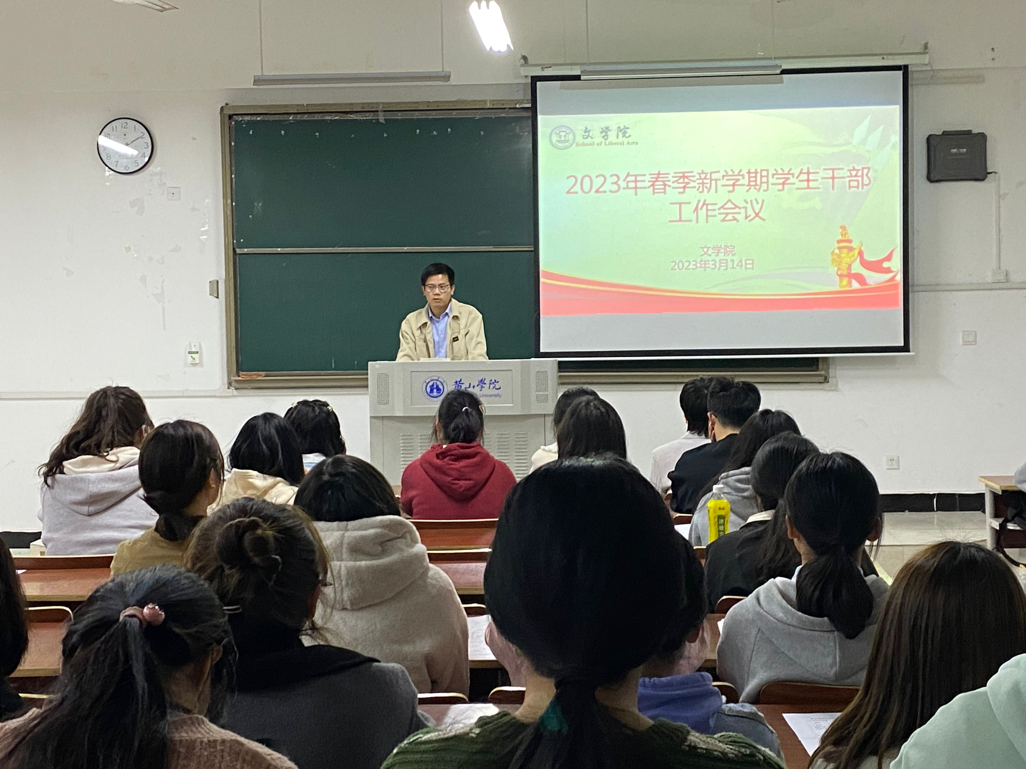 新学期新征程,为推动我院学生工作顺利开展,3月14日晚,我院在文端楼2206教室召开新学期学生干部会议。院党总支副书记周志荣出席会议,院团总支负责人王星勇主持会议。