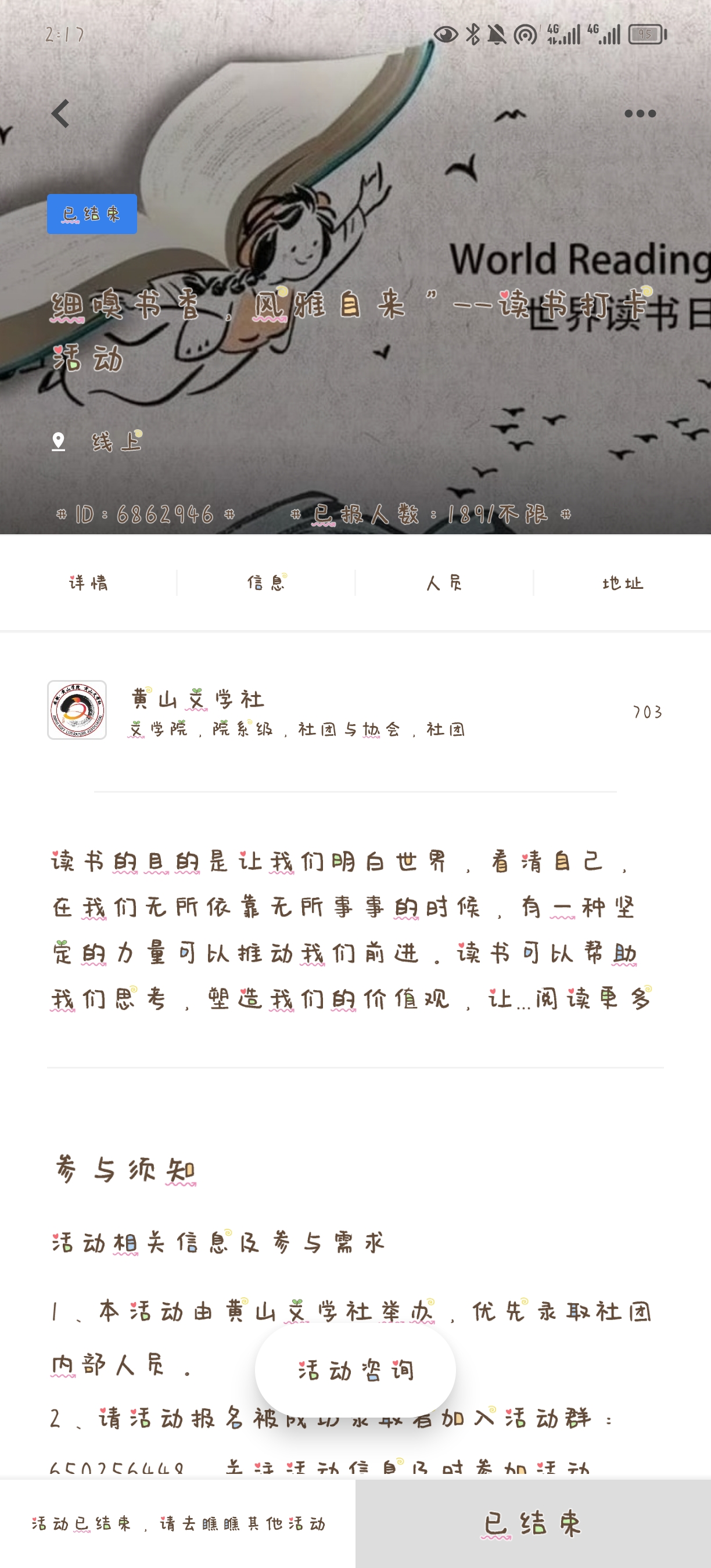 学问勤中得,萤窗万卷书。2022年12月12日,由黄山文学社举办的细嗅书香,风雅自来活动圆满完结,参与人数约150人。