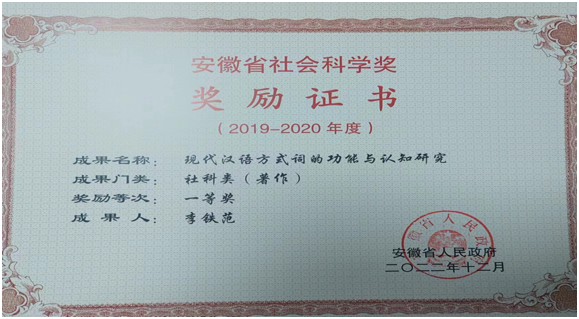 近日,我院李铁范教授专著《现代汉语方式词的功能与认知研究》(科学出版社),通过专家严格评审,喜获得安徽省人民政府2019—2020年度省社会科学奖一等奖,这是我校办学以来首次获得该等次奖项。