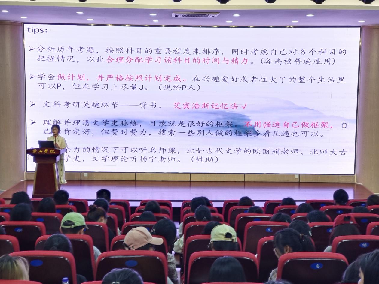 分享会上,20中文一班殷梦雪和22中文专升本一班徐云燕分享了备战考研的经验。她们结合自身经历,围绕目标选择、备考规划、学习方法、心态调整等方面展开分享,强调时间管理,理解记忆,提高效率,同时,要注重身体锻炼,调整心态,坚定信念,以积极健康的心态备战。