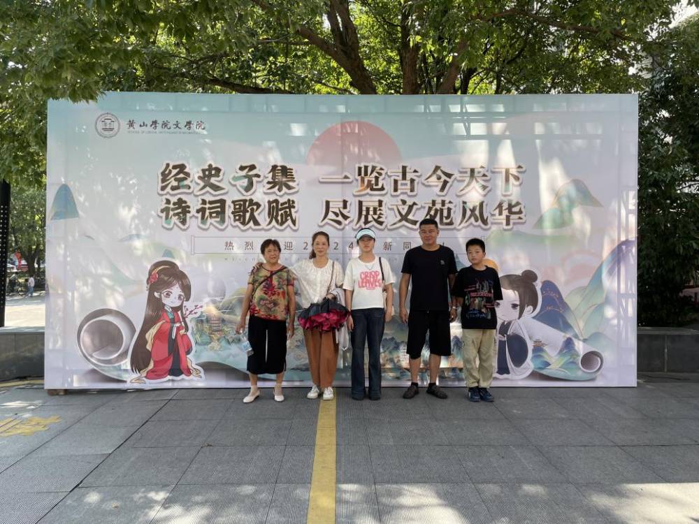 文端楼前,悬挂多条印有名言警句的诗词横幅和古风韵味的迎新海报,寄托了学院领导和老师对新生的殷切希望和美好祝福,吸引了众多新生和家长们驻足留影,用镜头记录下与文学院的初次相遇。
