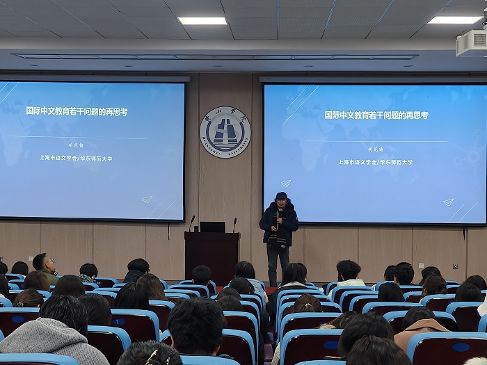 12月26日晚,华东师范大学胡范铸教授应邀为我院师生作题为《国际中文教育的若干问题》的学术报告。报告会在文端楼二楼报告厅举行,文学院师生近200人参加活动,文学院院长沈昌明主持报告会。