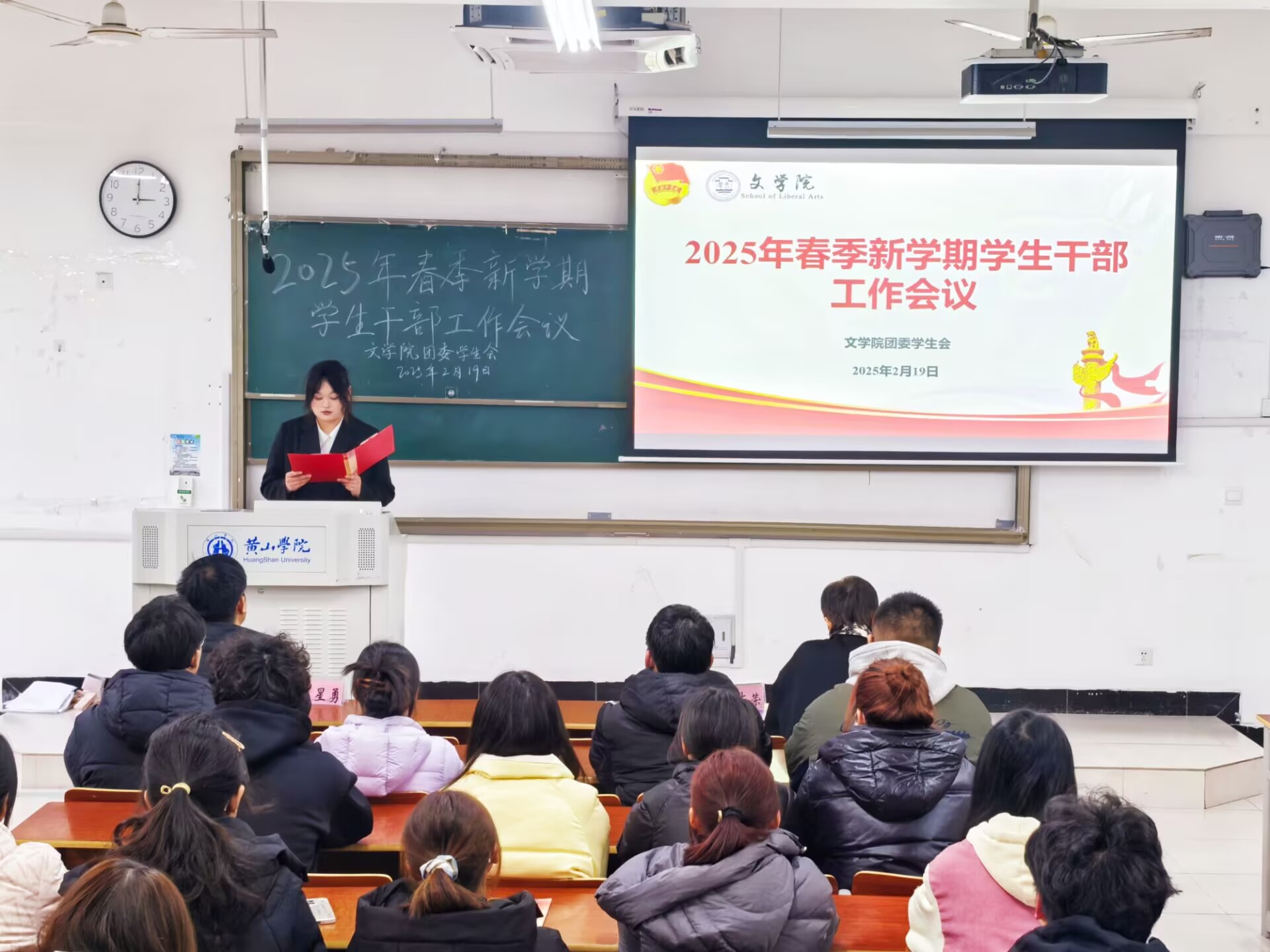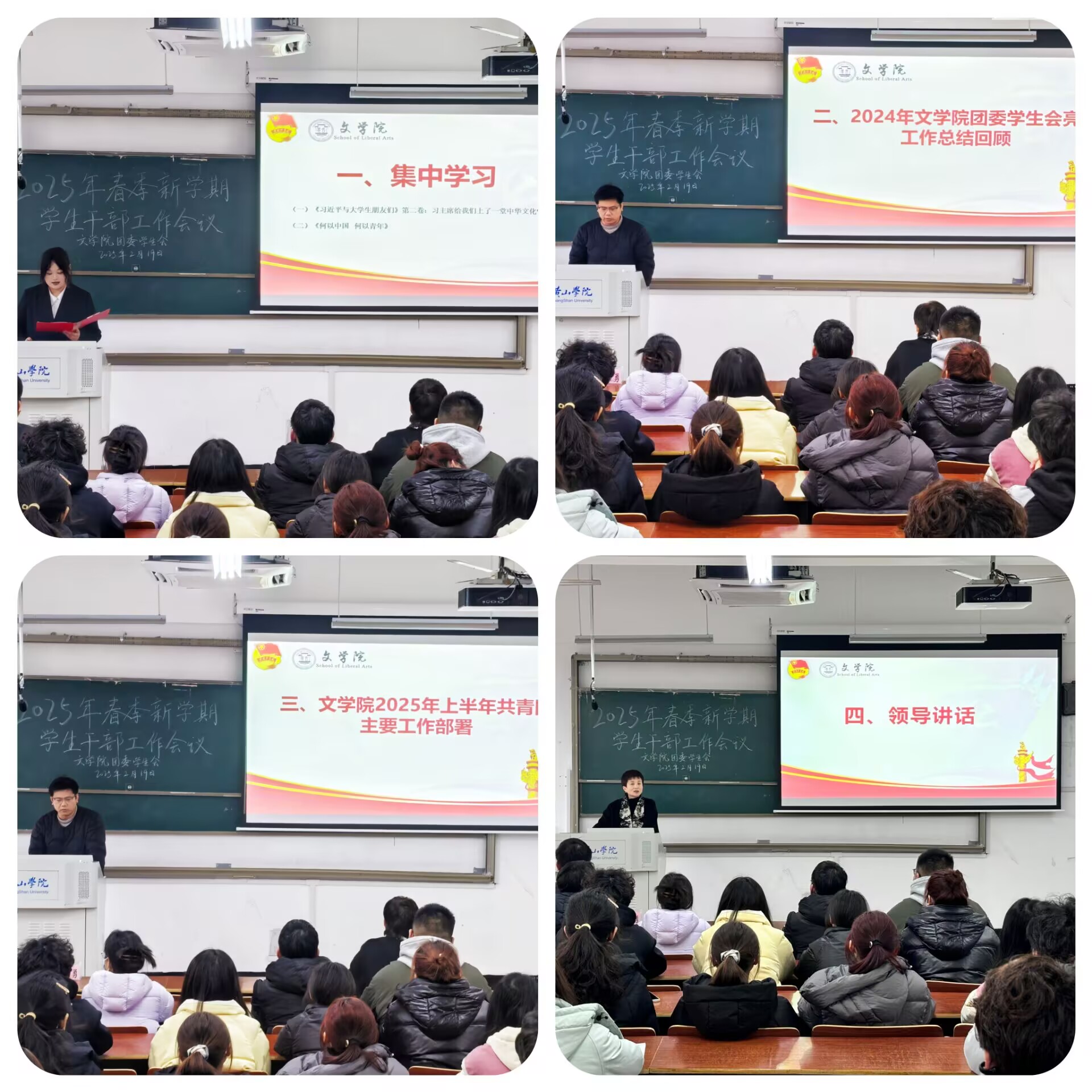 2月19日下午,文学院于文端楼2305教室召开2025年春季新学期学生干部大会,院党总支副书记周志荣、团委负责人王星勇以及全体学生干部参加会议。